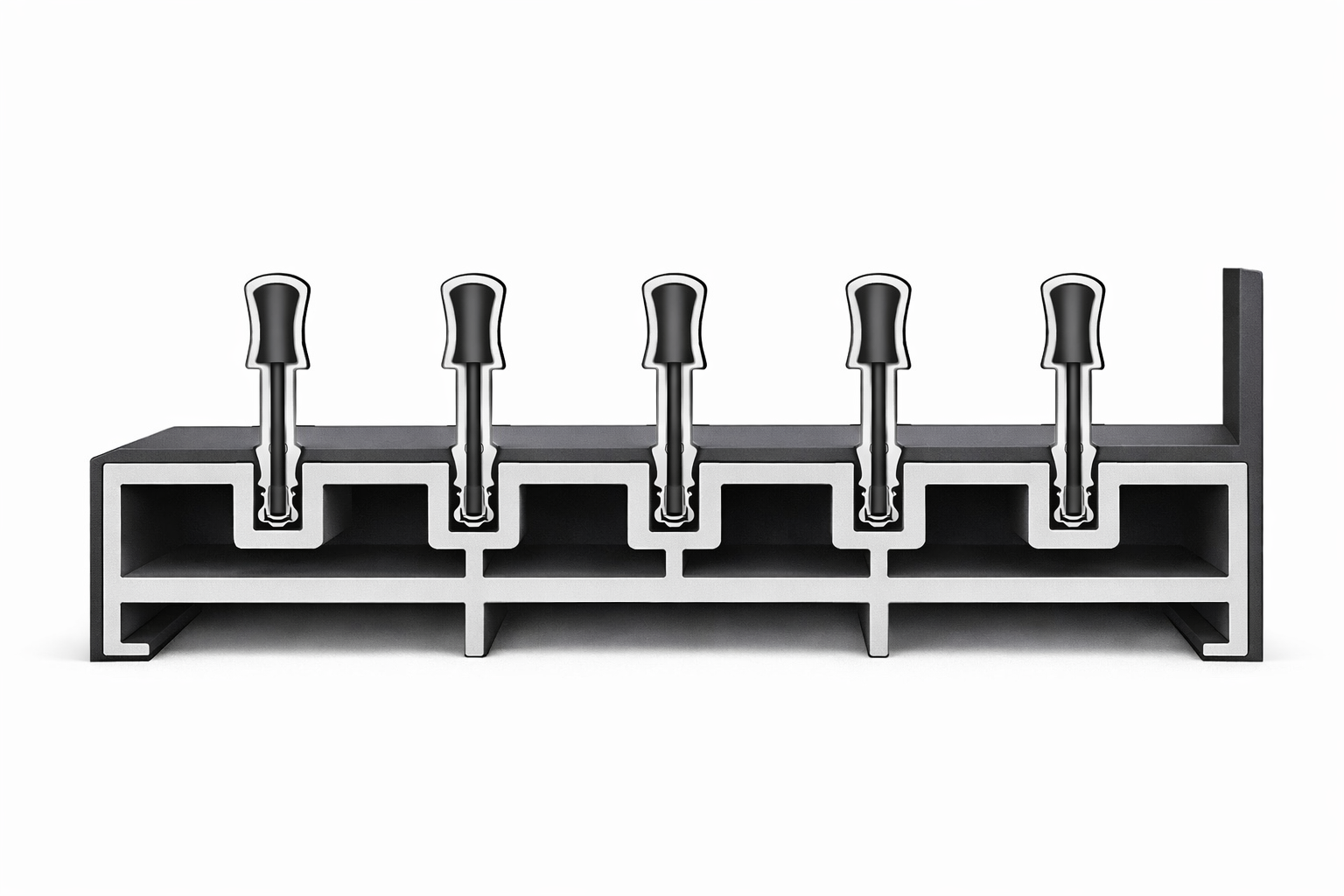 Szyna 5-torowa do systemu bezramowego to zaawansowana technologicznie prowadnica aluminiowa przeznaczona do dużych i nowoczesnych zabudów tarasowych. Umożliwia montaż aż pięciu niezależnie przesuwnych paneli szklanych, dzięki czemu pozwala zabudować szerokie światła przejścia i jednocześnie zachować pełną funkcjonalność otwierania przestrzeni. Każde skrzydło porusza się po oddzielnym torze, co zapewnia płynne, lekkie i ciche przesuwanie bez zacinania.